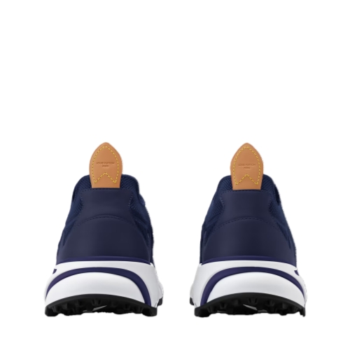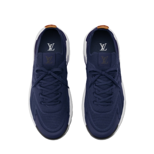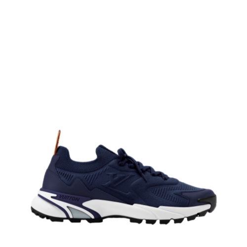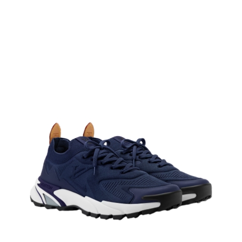 The LV Runner Tatic sneaker is reinterpreted in a single piece of technical knit with distinctive textured details, including a dynamic LV signature on the side. The upper is complemented by calf-leather trim and a back tab in emblematic natural leather, whose shape references the handle mounts of Louis Vuitton leather goods. This sneaker has an easy, slip-on fit.