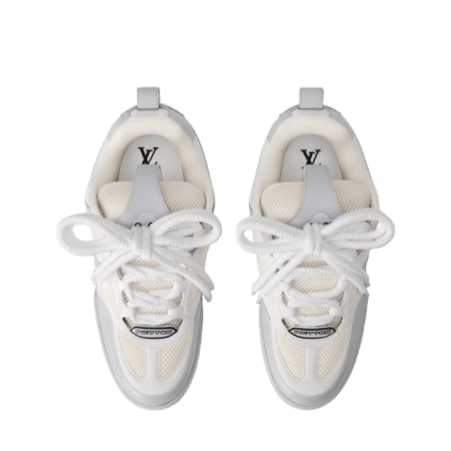 This colorblock version of the LV Skate sneaker comes in a mix of nubuck calf leather and technical mesh. Inspired by Nineties' skate shoes, this model is notable for its thick double laces and exaggerated, padded collar and tongue. It has an oversized Monogram Flower on the side and an LV Vuitton logo on the tongue.