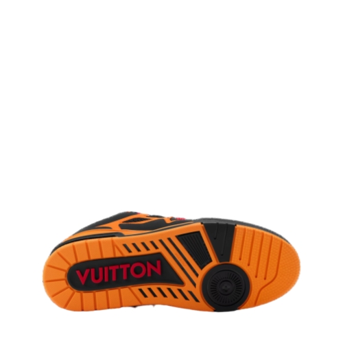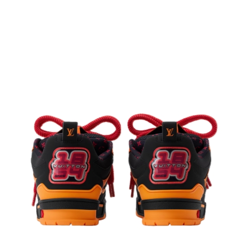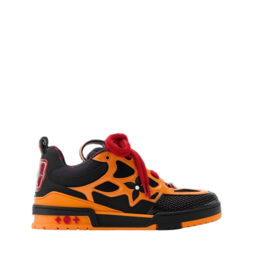 Combining technical mesh and smooth calf leather, this version of the LV Skate sneaker comes in a vibrant color palette that makes a bold style statement. Inspired by Nineties' skate shoes, this model is notable for its exaggerated, padded collar and tongue. Signatures include a large Monogram Flower on the side and a Vuitton since 1854 motif at the back.