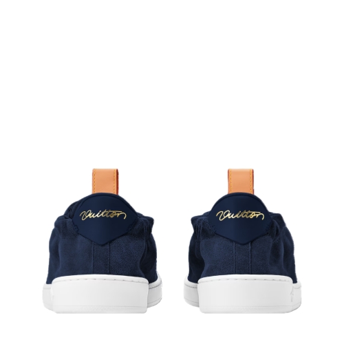 Ultra-soft suede calf leather complements the design of the LV Soft sneaker. This model has a modern construction, combining laces with an elasticized heel for an easy, slip-on fit. It is finished with refined details, including a back loop and LV Initials label in natural leather and a Vuitton signature created by Pharrell Williams at the back.