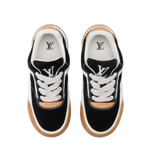 The LV Tilted sneaker is a low top sneaker staple from menswear wardrobe inspired by vintage 2000s volumes. It takes its name from the slightly inclined and embroidered LV Initials signature on its tongue. Key details of this model are the wide textile laces giving a bold look and the chunky rubber outsole with a Damier-pattern toe cap and Monogram flowers details on the outsole. This version comes in suede calf leather with emblematic Louis Vuitton natural leather enchape recalling the Maison craftsmanship.