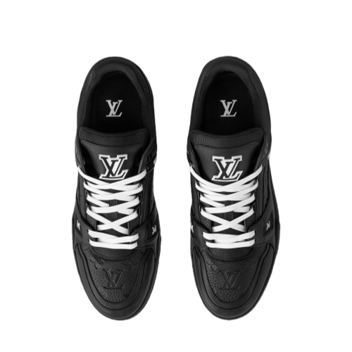 This version of the LV Trainer sneaker combines smooth calf leather with grained calf leather, which is embossed with Louis Vuitton's iconic Monogram pattern. This cult sneaker was designed by Virgil Abloh, who drew inspiration from vintage basketball sneakers. The rubber outsole, which is decorated with Monogram Flowers, is matched to the upper for a colorblock look.