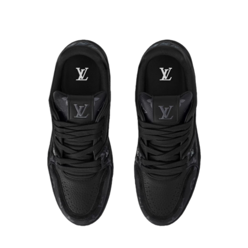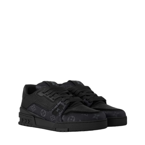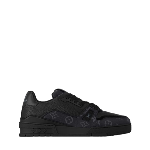 The LV Trainer Sneaker is revisited in Monogram Eclipse and Monogram Reverse canvas. Inspired by basketball sneakers, this cult design has an elaborately constructed upper. It is finished with a contrasting white rubber outsole, which is decorated with Monogram Flowers.