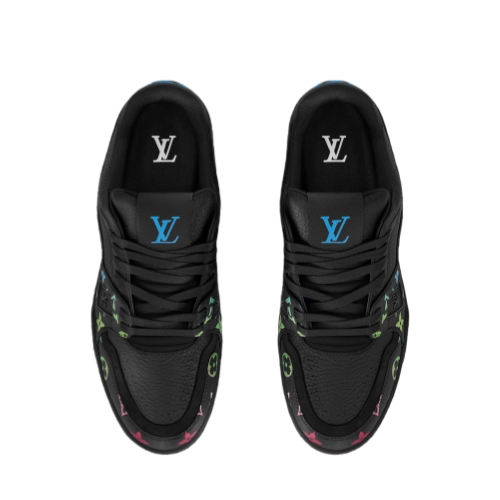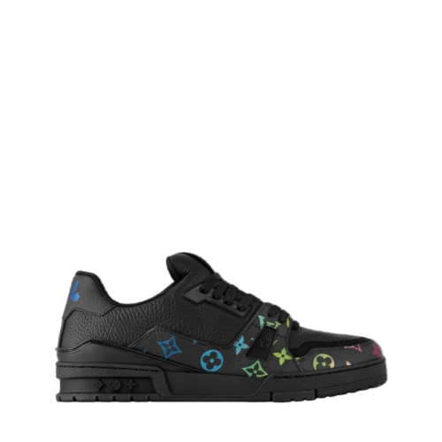 The iconic LV Trainer sneaker is crafted from grained calf leather with a colorful gradient Monogram pattern that coordinates with the season's Leather Goods and Ready-to-Wear. Emblazoned on the back is the #54 signature, referring to 1854, when the House was founded. This model comes on a technical rubber outsole decorated with Monogram Flowers.