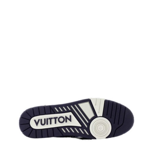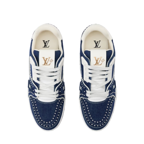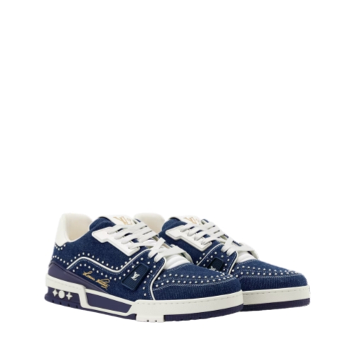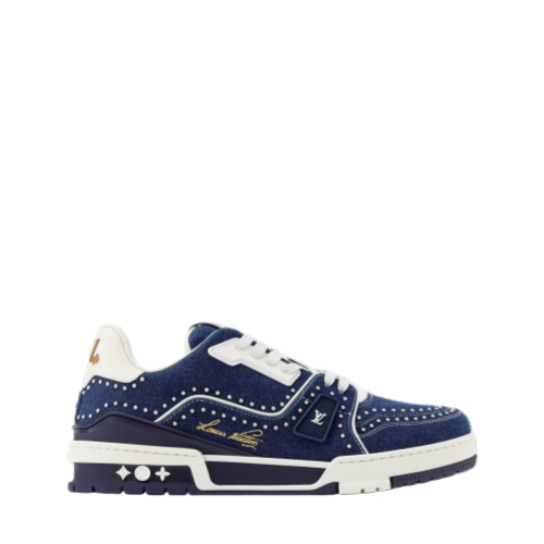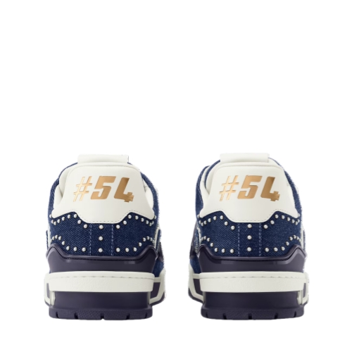 An icon of the shoe collection, the LV Trainer sneaker returns in a richly embellished version combining denim with Swarovski pearls, which highlight the elaborate construction of its upper. This model is notable for its multiple signatures, including Louis Vuitton in script lettering on the side and #54, referring to 1854, when the House was founded, at the back.