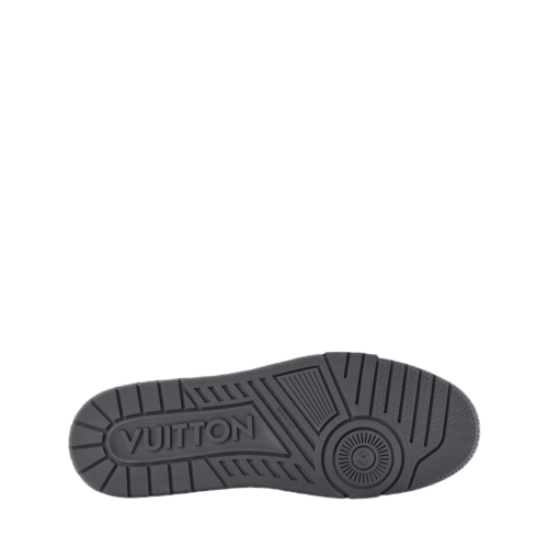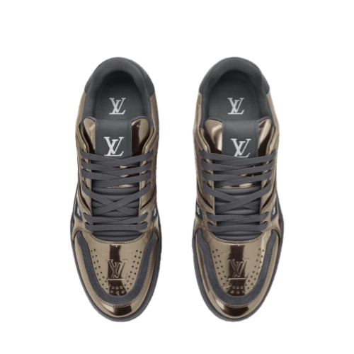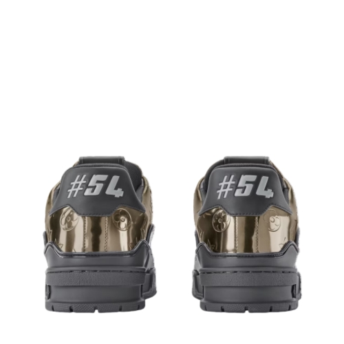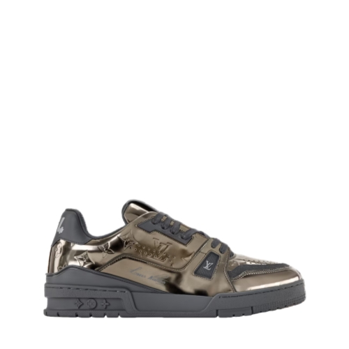 The LV Trainer sneaker is revisited in Monogram-embossed synthetic leather with a metallic mirror finish that coordinates with the leather goods collection. This iconic model is carefully assembled from more than 80 separate pieces. It features an LV Initials signature on the side and #54 at the back, referring to 1854, when the House was founded.