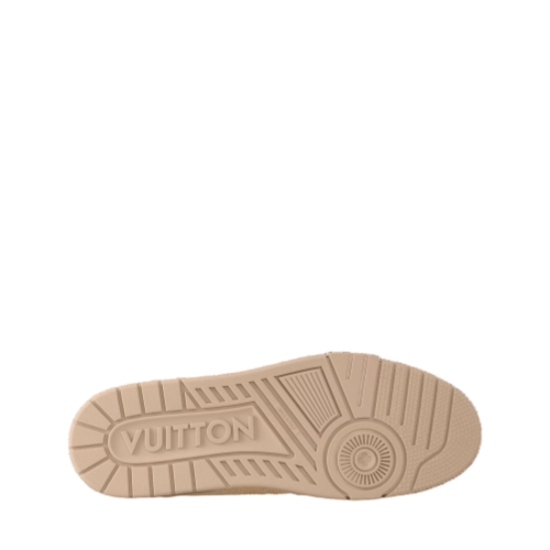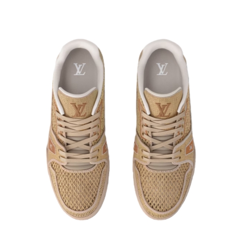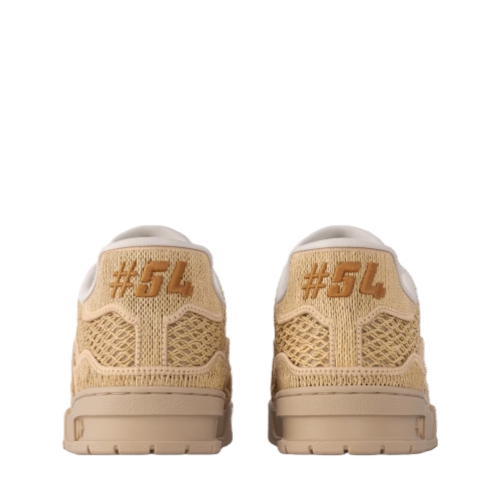 The LV Trainer sneaker is revisited in raffia, coordinating with the color palette of the Prefall 2025 collection. The elaborately constructed upper, which references vintage basketball sneakers, is embroidered with the LV Initials and Louis Vuitton script signatures. The tonal rubber outsole is decorated with three Monogram Flowers.