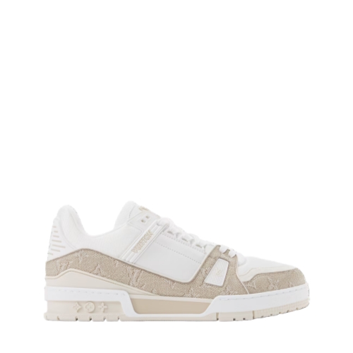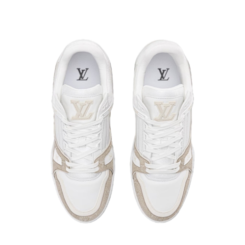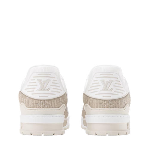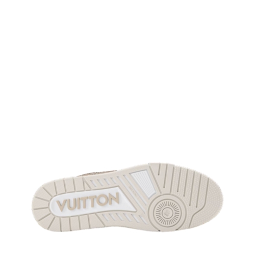 This edition of the LV Trainer sneaker in Monogram grained calf leather and plain calf leather coordinates with the Monogram Heritage theme of the leather goods, spotlighting historical colors and designs. The two-tone palette highlights the elaborate construction of the upper, which references vintage basketball sneakers. This model is mounted on a technical rubber outsole.