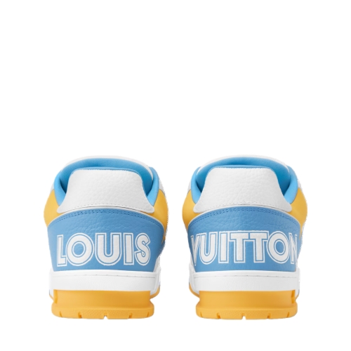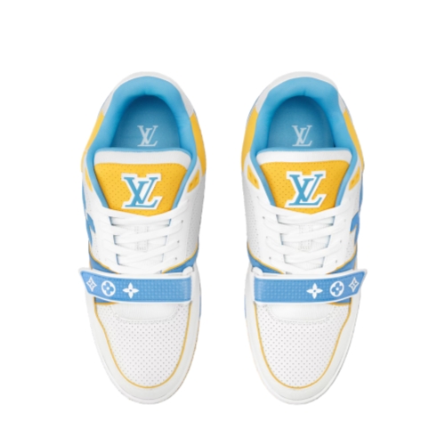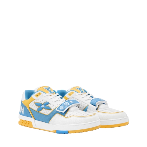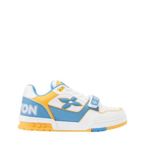 The iconic LV Trainer sneaker is revisited in perforated calf leather and a vibrant color palette inspired by college sports teams. This model is notable for its prominent signatures, including a large Monogram Flower on the side and an asymmetric Louis and Vuitton on the back. It also features a velcro strap decorated with Monogram Flowers.