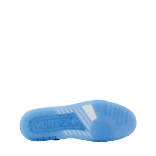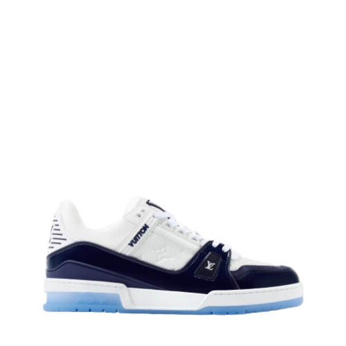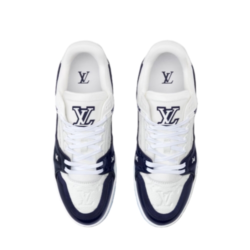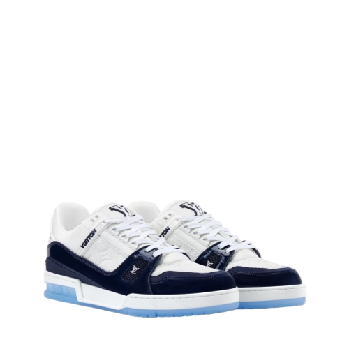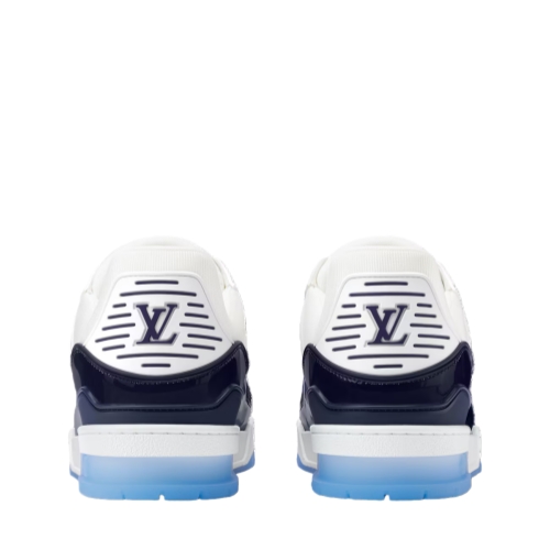 This striking two-tone edition of the LV Trainer sneaker combines Monogram grained calf leather with glossy patent leather, inspired by the shiny colors of basketball courts. This iconic model, originally designed by Virgil Abloh, is notable for its elaborately constructed upper, which is complemented by rubber LV Initials and Vuitton signatures.