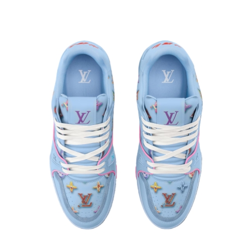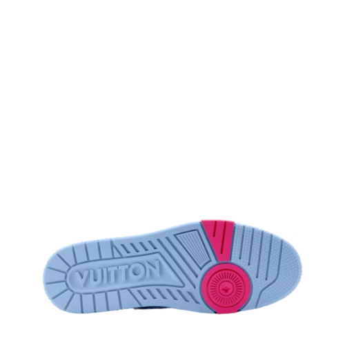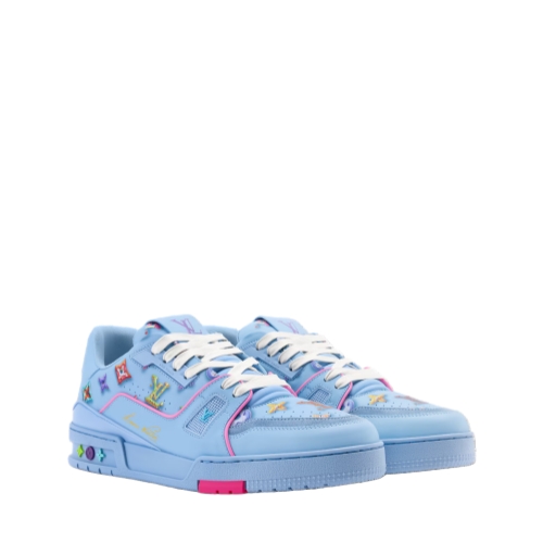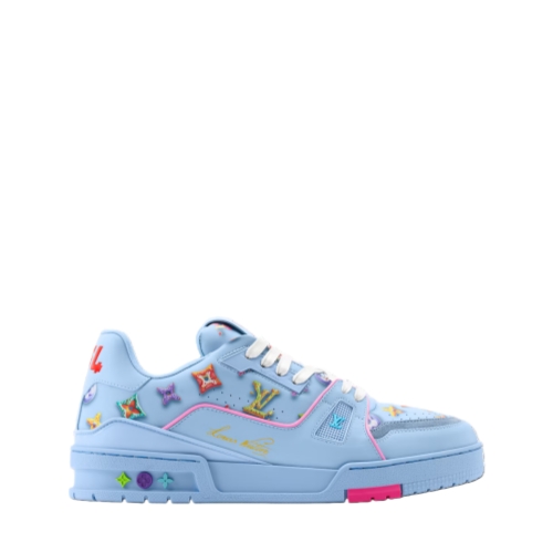 This vibrant iteration of the LV Trainer sneaker coordinates with the season's Monogram Donuts theme. The upper, fashioned from a mix of materials, is printed with House signatures, playfully reimagined in the spirit of sweet pastries, which bring fun and energy to every day. The tonal rubber outsole is decorated with three colorful Monogram Flowers.