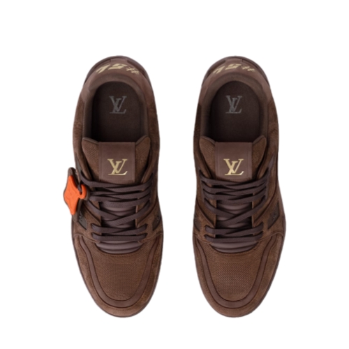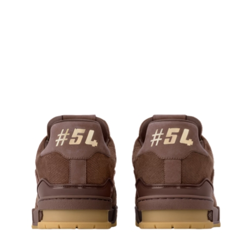 The LV Trainer sneaker is reinterpreted in nubuck calf leather embossed with the Damier pattern. This cult design, which references vintage basketball sneakers, is notable for its many signature details. These include removable Monogram Flower tags on the laces and the #54 signature on the back, referring to 1854, when the House was founded.