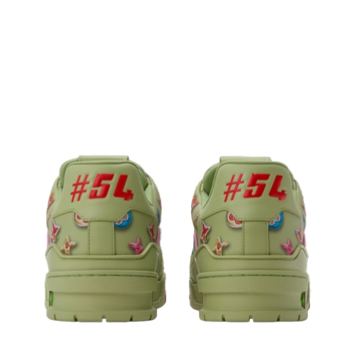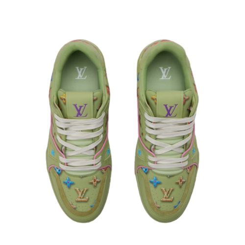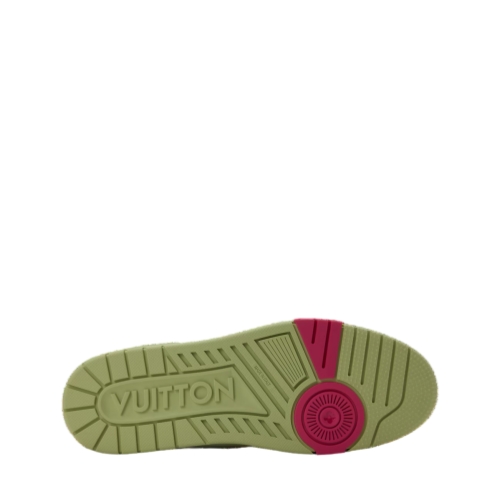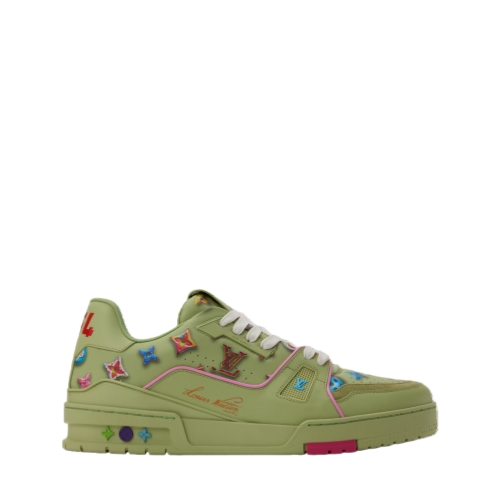 This vibrant iteration of the LV Trainer sneaker coordinates with the season's Monogram Donuts theme. The upper, fashioned from a mix of materials, is printed with House signatures, playfully reimagined in the spirit of sweet pastries, which bring fun and energy to every day. The tonal rubber outsole is decorated with three colorful Monogram Flowers.