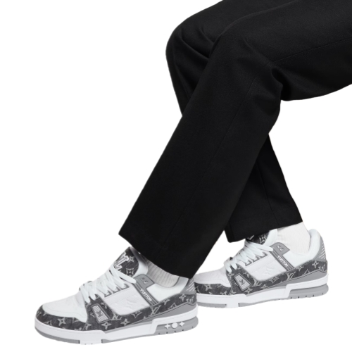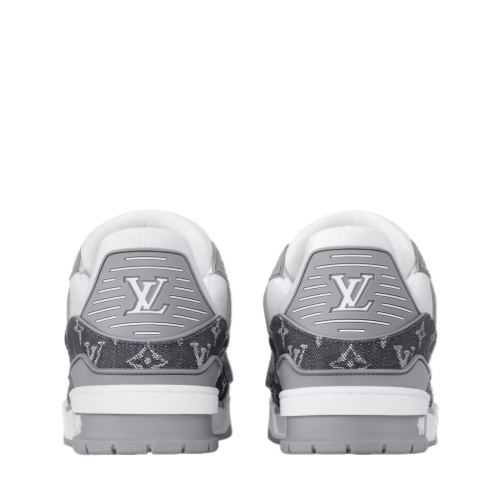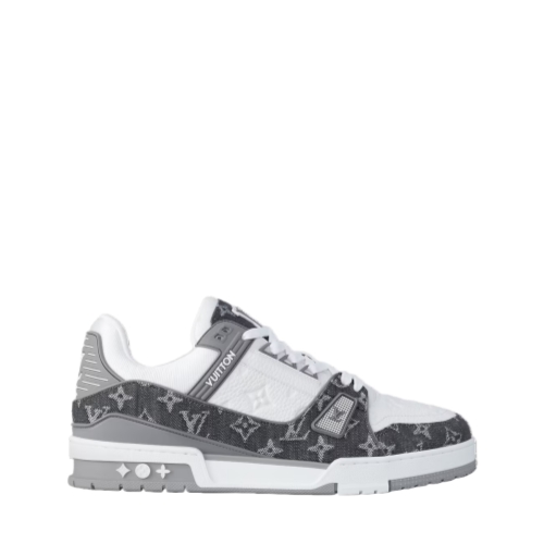 The iconic LV Trainer sneaker, originally designed by Virgil Abloh, is revisited this season in a combination of Monogram denim and Monogram-embossed grained calf leather. This model is characterized by its elaborately constructed upper and multiple signatures, including the LV Initials on the tongue and back, and Monogram Flowers on the technical rubber outsole.