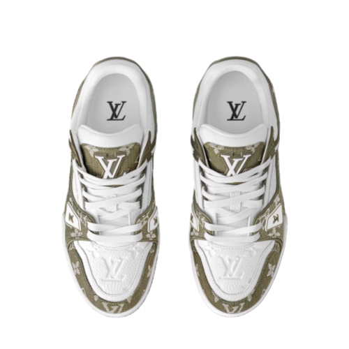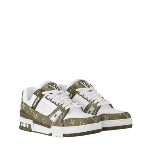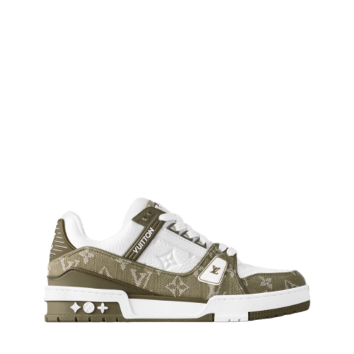 This edition of the LV Trainer sneaker combines Monogram denim with Monogram grained calf leather. The juxtaposition of two colors and two materials highlights the elaborately constructed upper of this cult sneaker, which was originally designed by Virgil Abloh. It is complemented by rubber LV Initials and Vuitton signatures and a two-tone rubber outsole.