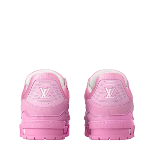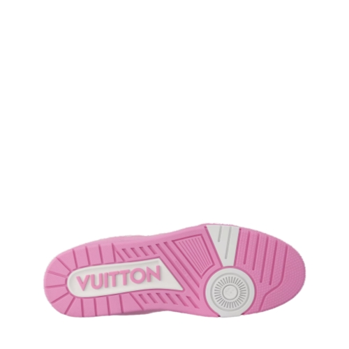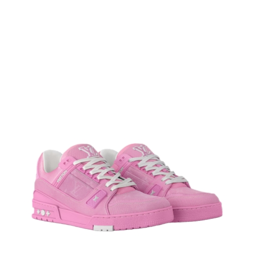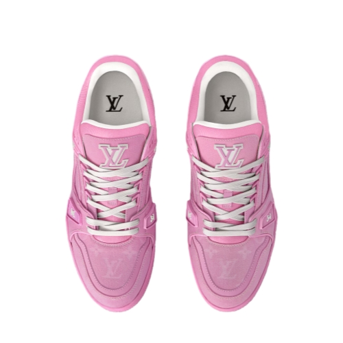 The LV Trainer sneaker is revisited in Monogram denim for a relaxed signature look. This cult design, which was inspired by vintage basketball sneakers, is notable for its elaborately constructed upper with rubber LV Initials and Vuitton signatures. It is finished with thick white laces and a two-tone rubber outsole decorated with Monogram Flowers.