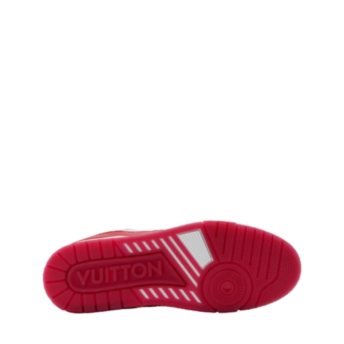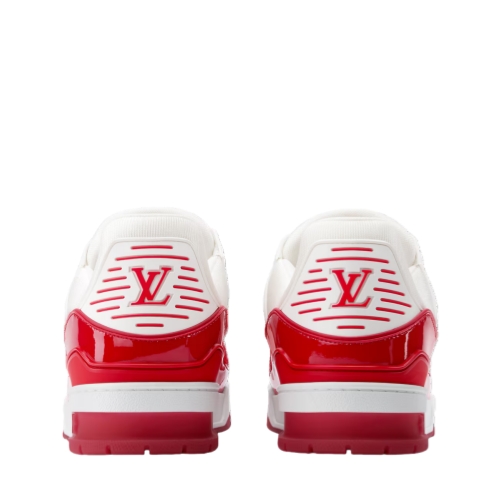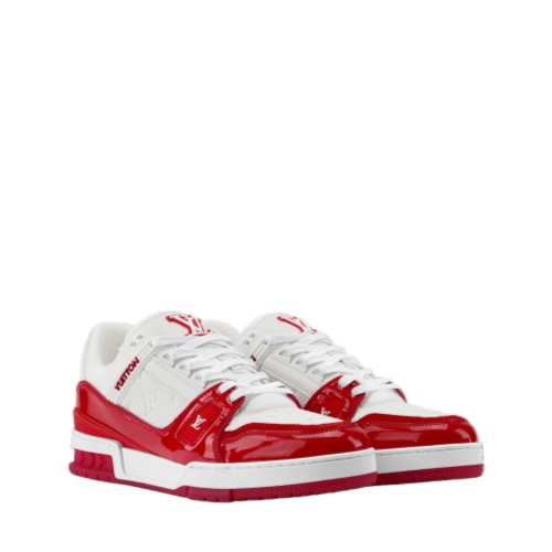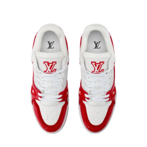 This striking two-tone edition of the LV Trainer sneaker combines Monogram grained calf leather with glossy patent leather, inspired by the shiny colors of basketball courts. This iconic model, originally designed by Virgil Abloh, is notable for its elaborately constructed upper, which is complemented by rubber LV Initials and Vuitton signatures.