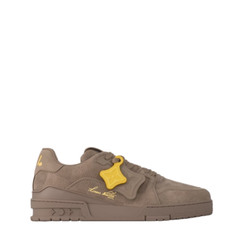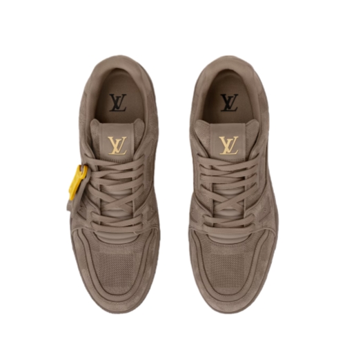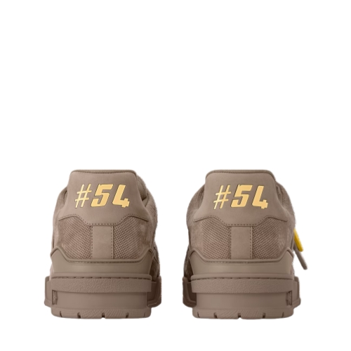 The LV Trainer sneaker is reinterpreted in nubuck calf leather embossed with the Damier pattern. This cult design, which references vintage basketball sneakers, is notable for its many signature details. These include removable Monogram Flower tags on the laces and the #54 signature on the back, referring to 1854, when the House was founded.