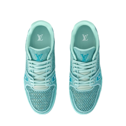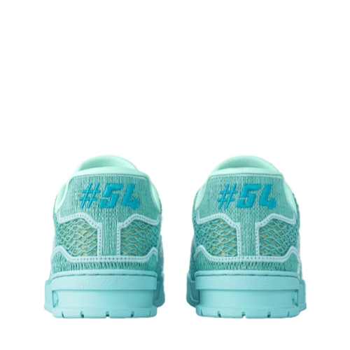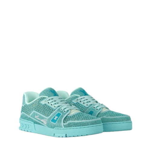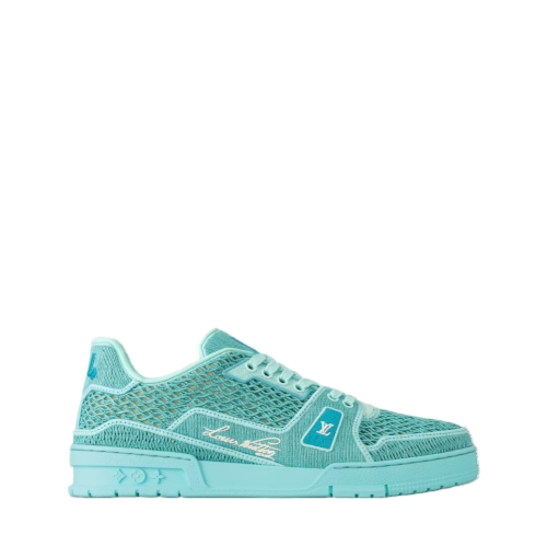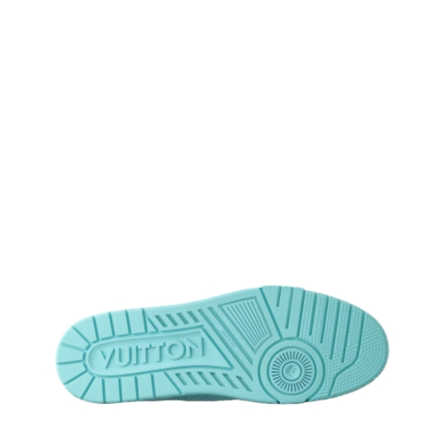 The LV Trainer sneaker is revisited in raffia, coordinating with the color palette of the Prefall 2025 collection. The elaborately constructed upper, which references vintage basketball sneakers, is embroidered with the LV Initials and Louis Vuitton script signatures. The tonal rubber outsole is decorated with three Monogram Flowers.
