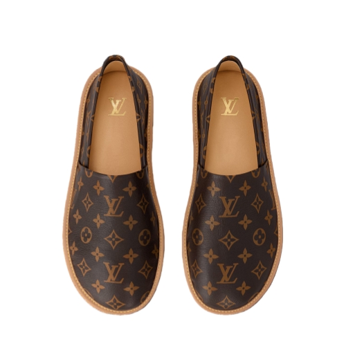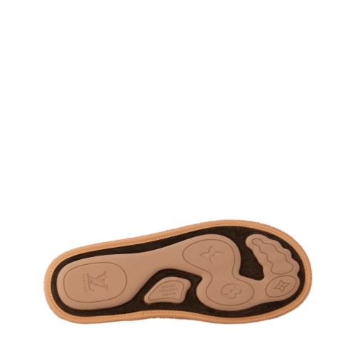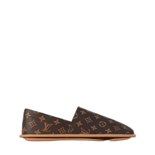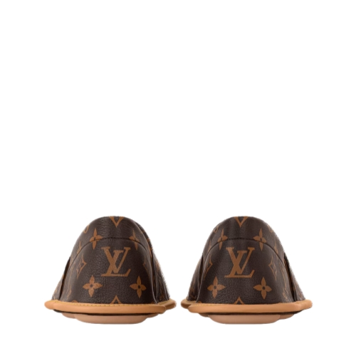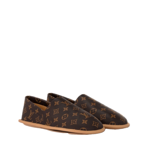 The LV Traveller slipper is crafted from smooth calf leather replicating the look of the House's iconic Monogram canvas. Notable for its hand-stitched vamp, this model has a tubular construction for lightness and a memory-foam insole for comfort. It is finished with a rubber footprint outsole signed with the LV Initials and Monogram Flowers.