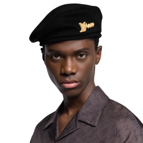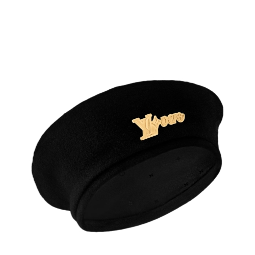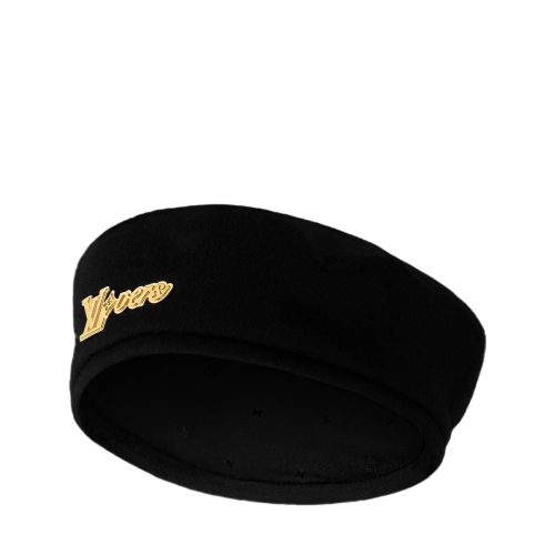 The LV Vers beret is a stylish topper, combining a timeless shape with fresh elements special to the House. The black wool hat is embellished with the signature newly designed and released by creative director Pharrell Williams, here rendered in a stunning gold-tone that catches the eye. This is a chic look with panache, no matter what it pairs with.