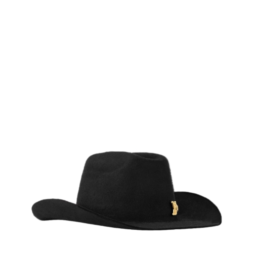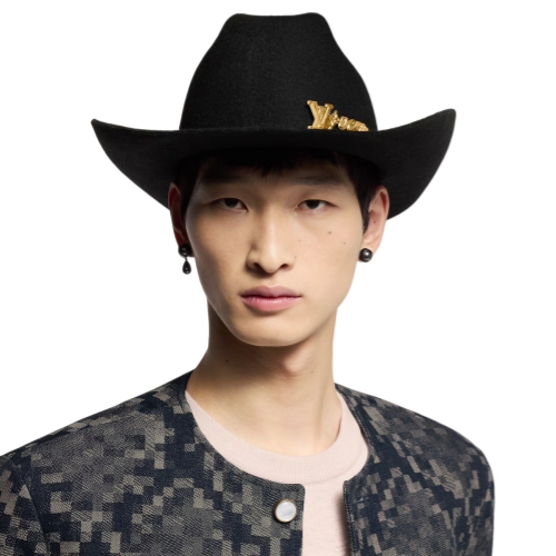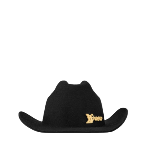 The LV Vers cowboy hat gives a decadent yet subtle upgrade to the Western icon with a cheeky House emblem. The classic and impactful pairing of black wool and gold hardware adds a healthy amount of drama to the look as a shiny LV Vers signature sits above the wide brim.