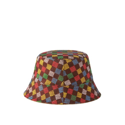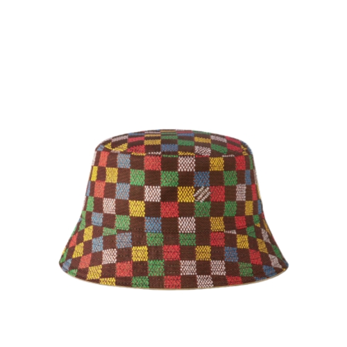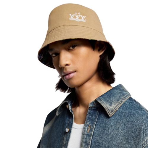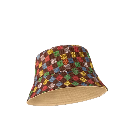 The LV Vers Damier Reversible Bucket Hat is a lively style that introduces the new multicolored pattern that combines the classic Damier print with LV Vers, a recent addition to the repertoire from Pharrell Williams. On the checkered side is another hallmark from Williams, the Marque L.Vuitton Déposée signature, and on the solid side, the LV Vers United signature.
