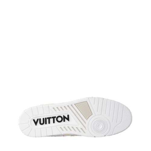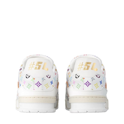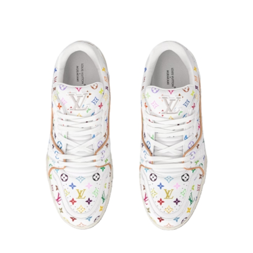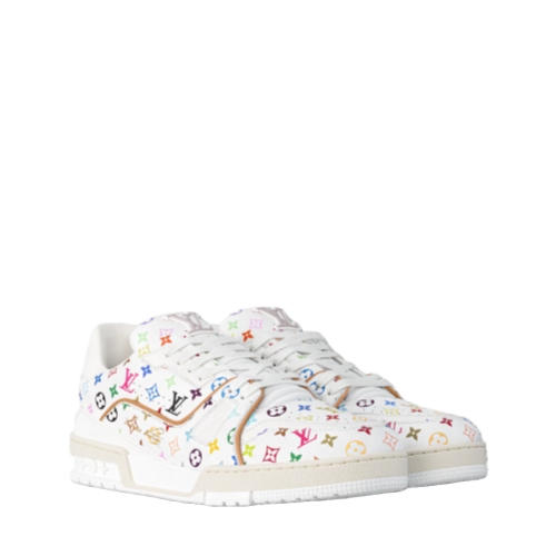 The iconic LV Trainer sneaker makes a fresh statement in grained calf leather featuring an allover print of a multicolored Monogram motif from the re-edition of Louis Vuitton x Murakami collection, inspired by the artist’s exuberant aesthetic. Informed by vintage sporty styles, the upper is detailed with a cursive Louis Vuitton signature, while the back is printed with the number 54 in reference to 1854, the year the House was founded.