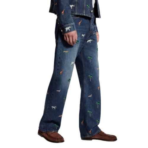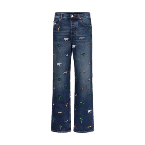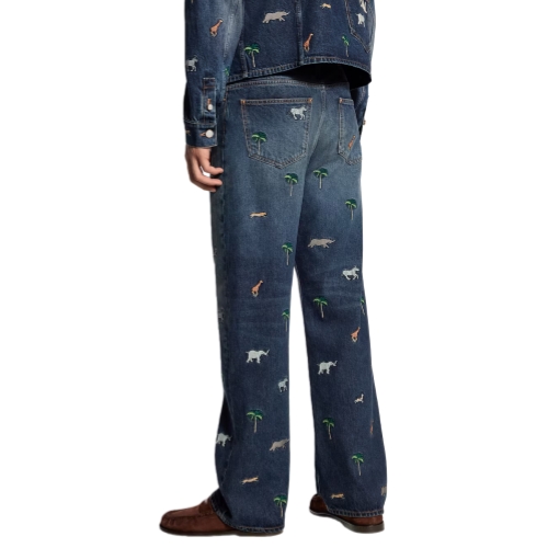 These graphic denim skate pants are adorned with the Spring-Summer 2026 show’s iconic LV x The Darjeeling Limited motif, featuring vibrant embroideries of palm trees and animals all over. Signature details include L.V.M. embroidery on the rear right pocket and a nubuck Mini Damier jacqueron. Pair with a matching shirt for a total look.