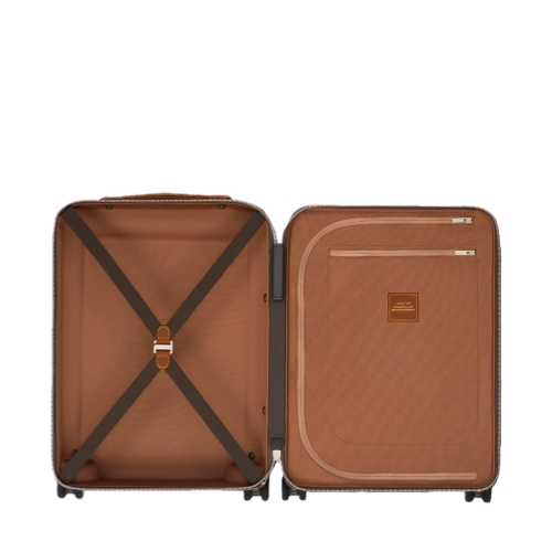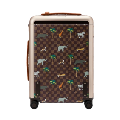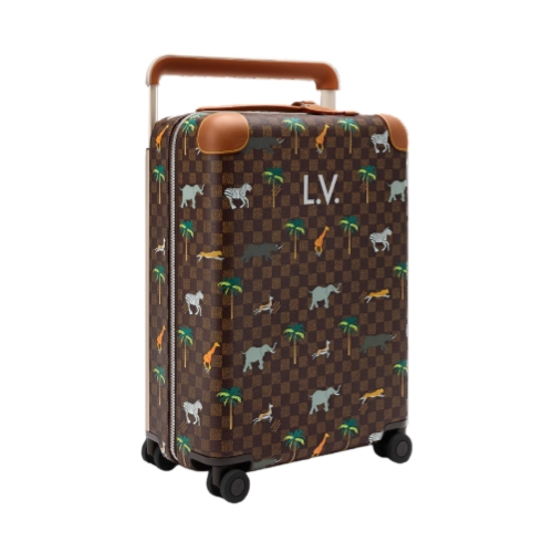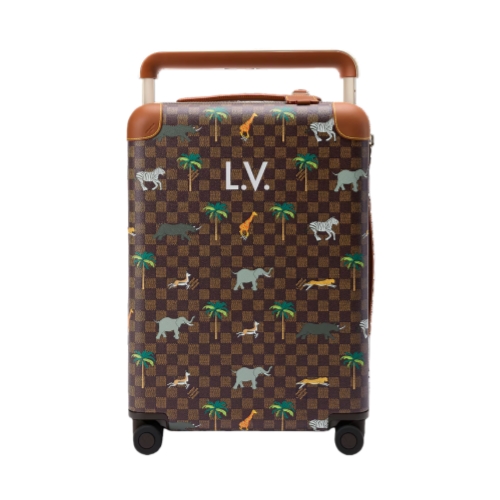 The Horizon 55 rolling suitcase is made from Damier Ebene Heritage canvas, featuring illustrations of wild animals from the savannah as part of the LV x The Darjeeling Limited collection. Brown leather trim on the reinforced corners and cane handle accentuates the darker palette. Its cabin-size format offers an unexpectedly spacious interior.