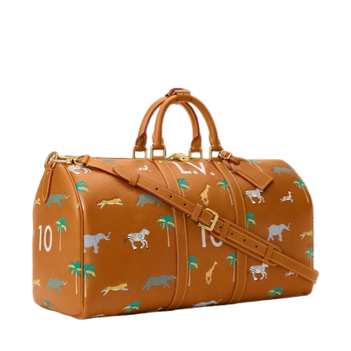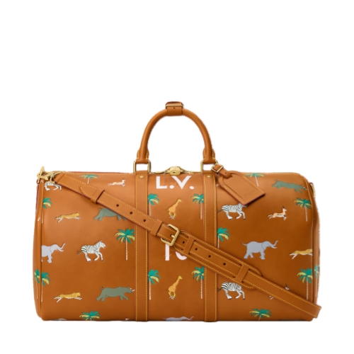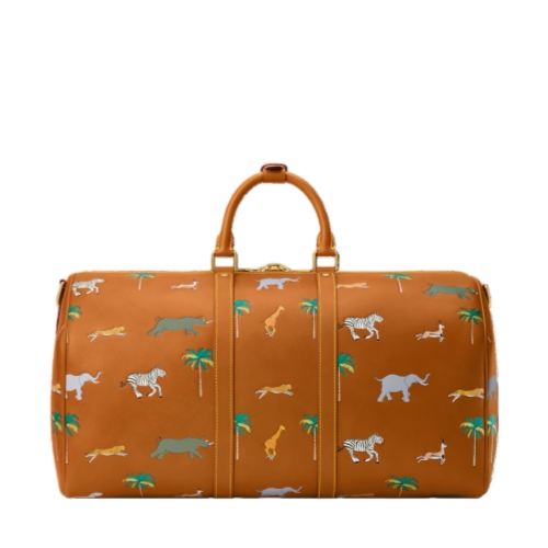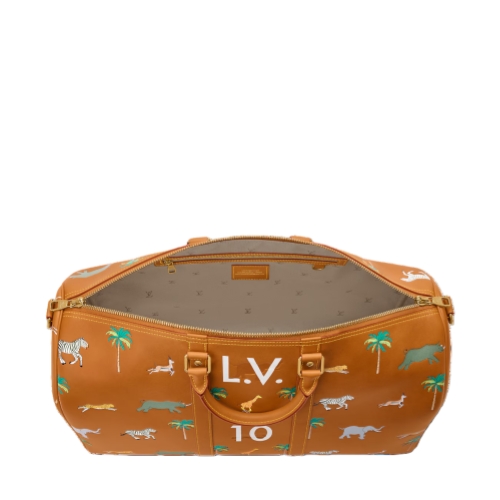 Part of the LV x The Darjeeling Limited collection, this Keepall Bandoulière 50 is crafted from naturally tanned calfskin with a sfumato patina finish that echoes archival leather. Embossed and inkjet-printed exotic animals create a raised effect across the surface. It’s signed with the bold Louis Vuitton initials featured in the film.