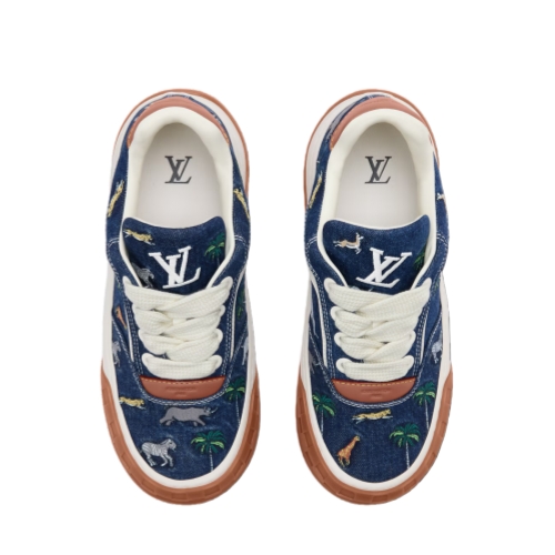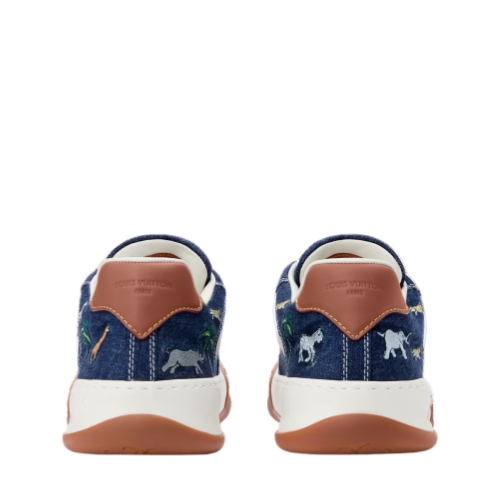 Drawing inspiration from the 2007 movie, which featured bespoke luggage created by the House, the Louis Vuitton x The Darjeeling Limited LV Tilted sneaker comes in denim embroidered with motifs of cross-continental flora and fauna. The upper is complemented by white laces and natural leather trim, while the tongue and outsole bear the distinctive tilted LV Initials signature.