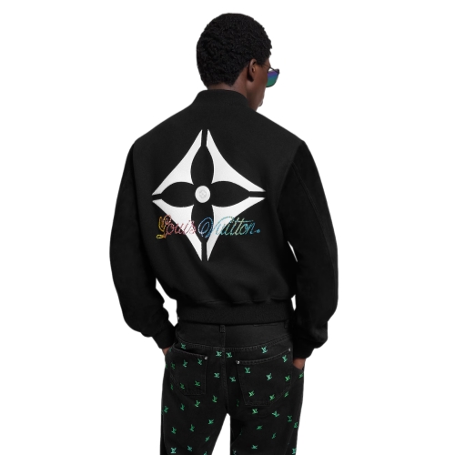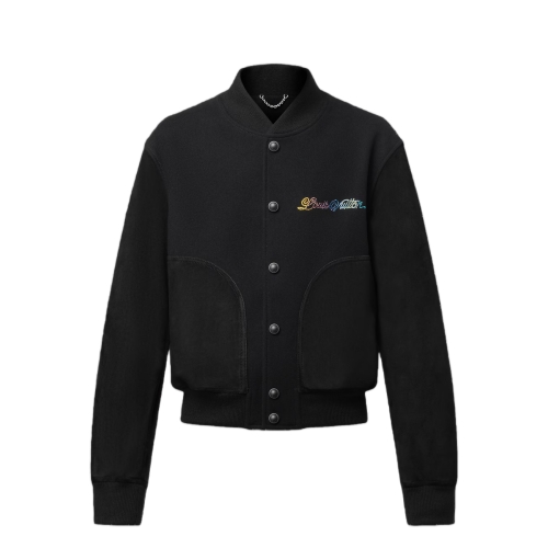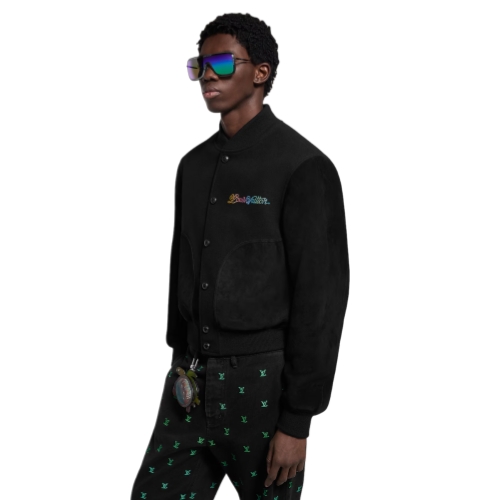 This elegant take on the varsity jacket comes in sober black tones, with the sleeves and pockets crafted from nubuck leather. The wool body is embellished with a Louis Vuitton signature in an elegant cursive script in graduated colors on the chest, while a large white embroidered Monogram Flower adorns the back beneath a pearly embroidered signature.