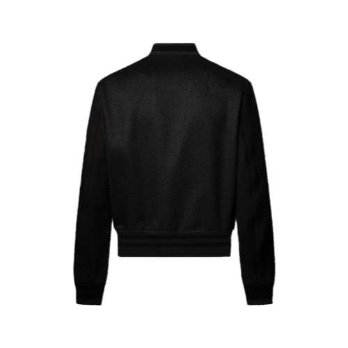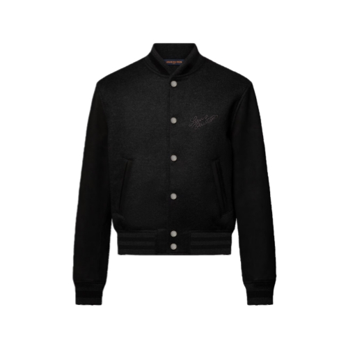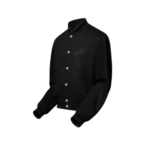 This luxurious piece draws on the Louis Vuitton savoir-faire to reinvent the varsity jacket with a timeless pared-down style. The dark grey silk-wool blend body and nubuck sleeves have an ultra-soft handle, while a tone-on-tone embroidered Louis Vuitton adorns the chest with an elegant cursive. Mother of pearl-effect snap buttons add a dandy finishing touch to this elegant design.