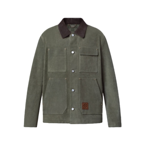 This leather workwear jacket has a sophisticated textured finish resembling linen. Playful trompe l’oeil detailing extends to the ribbed corduroy-like leather collar. Patch pockets with rivets and chic pearly buttons adorn the front, which is signed with a contrasting Marque L.Vuitton Déposée patch on the bottom left pocket. Crafted in a classic khaki green, this timeless style is easy to mix and match.