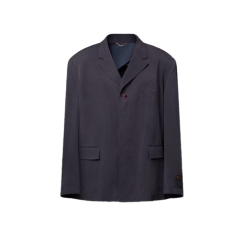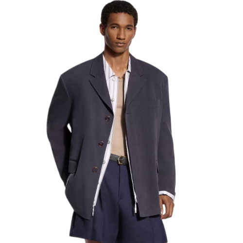 This softly structured jacket embodies the effortless elegance of the Spring-Summer 2026 show’s Indian Dandy inspiration. It is tailored in a purple wool-silk twill, with a striped fabric lining lending a sartorial accent to the sleeves, while a leather signature patch signs the left arm. This piece can be styled with a matching coat for an elegant layered effect.