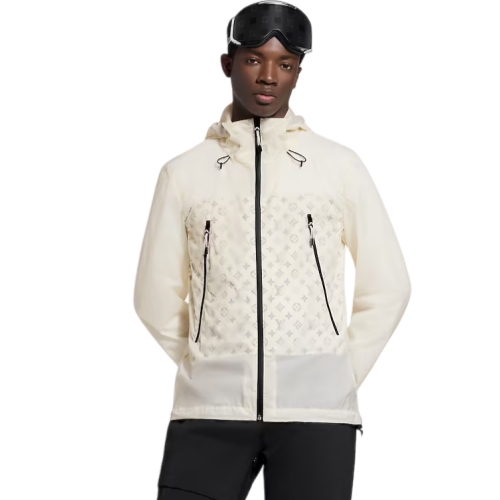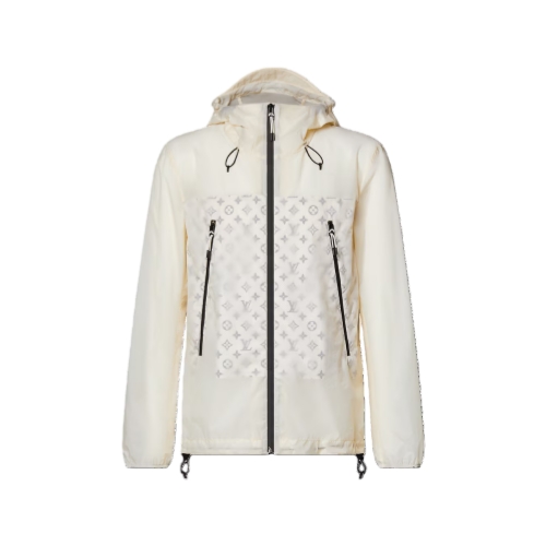 Conceived for active outdoor use, this technical hooded windbreaker also makes a stylish lightweight layer about town. It has an inner mesh panel with a contrasting allover Monogram motif overlaid with transparent milky white ripstop fabric. Black zipper details add a smart graphic accent, while a rear vent enhances ventilation. A rubber Vuitton patch adds a sporty accent to the back.