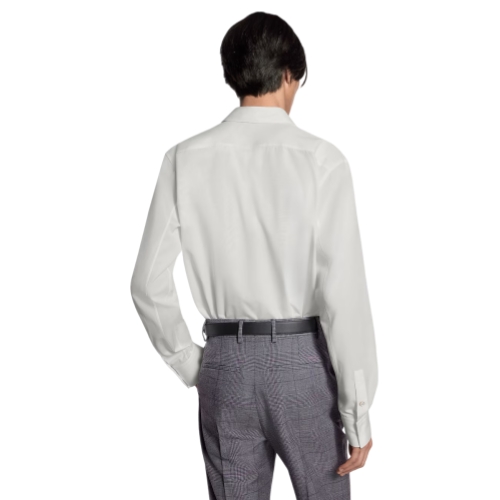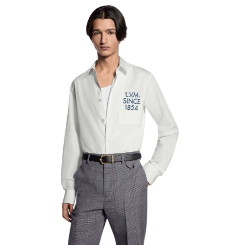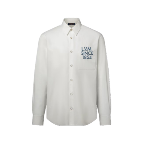 This crisp white shirt, cut from cotton poplin, is elevated with an LV Legacy signature from the Spring-Summer 2026 show. Inspired by the history of personalized Louis Vuitton trunks, it features contrasting blue L.V.M. lettering printed with a hand-painted effect across the breast pocket. This versatile piece can be styled with formal and everyday looks.