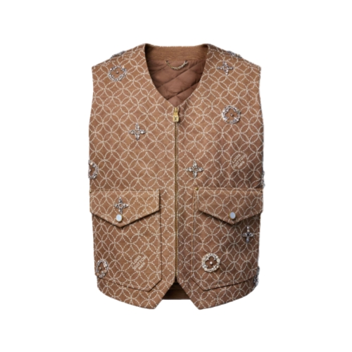 This exclusive quilted waistcoat from the Fall-Winter 2025 runway brings exquisite craftsmanship to a utilitarian workwear silhouette. Drawing on this season’s collaboration between Pharrell and Nigo, it features an embroidered allover Dandy Monogram motif inspired by the craft traditions of Nigo’s native Japan. Jewel-like Monogram Flower signatures are embroidered all over with rhinestone crystals, giving this made-to-order piece a glittering allure.
