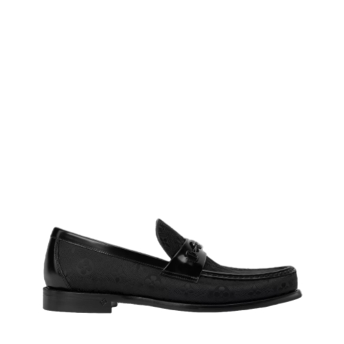This edition of the timeless Major loafer is made of jacquard fabric woven with a tone-on-tone Monogram pattern. Trim in glazed calf leather complements this refined design, which is notable for its traditional Blake construction and hand-stitched vamp signed with an LV Initials accessory. A leather and rubber outsole completes this model.