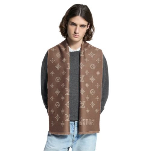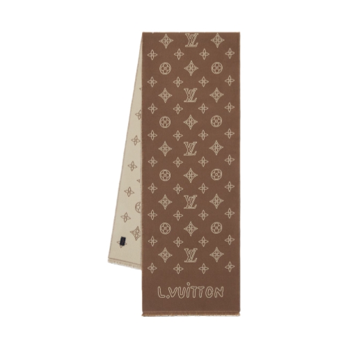 The Monogram Blast scarf showcases a refreshed interpretation of the House signature, now made more contemporary with outlined initials and flowers, plus a similarly written "L. Vuitton" above the short fringe. The graphic yet delicate pattern is set against a neutral tone, promising versatility and repeat wears, courtesy of its lightweight wool construction.