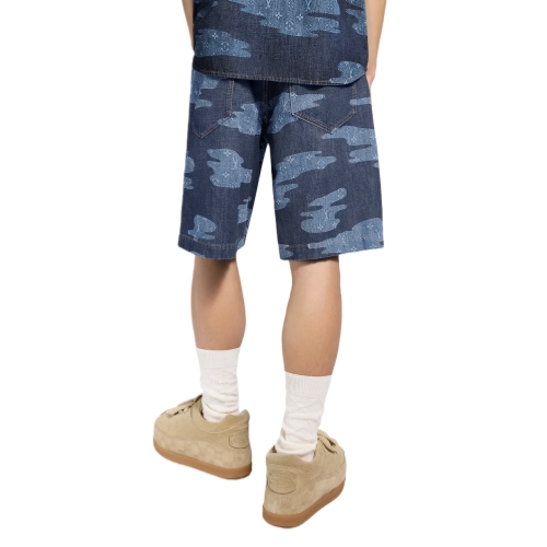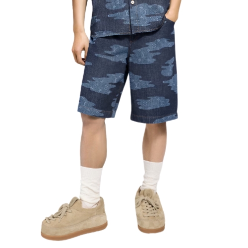 These graphic chambray shorts are a fresh choice for warm weather. They are elevated with a playful Monogram Clouds print from the Fall-Winter 2025 show, featuring patchwork-effect clouds of Monogram signatures floating over a deep indigo base. A nubuck Damier jacqueron signs the back, while a matching shirt makes a standout look.