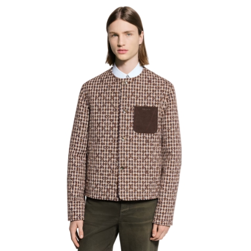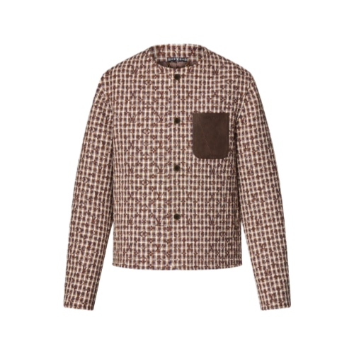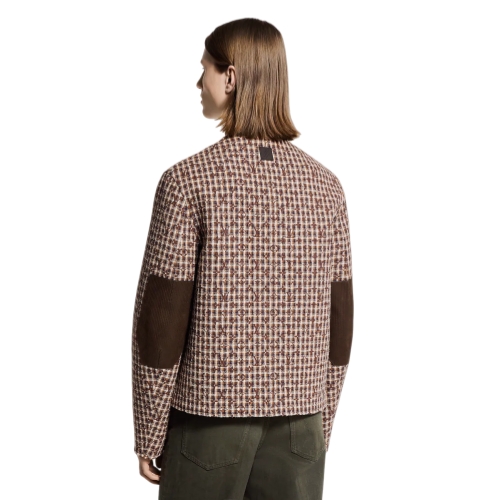 This chic collarless jacket is inspired by this collection’s British country house theme. Tailored in a Monogram-embellished tweed in rich brown tones, it is adorned with a leather breast pocket crafted with debossed signature lettering and a topstitched ‘V’. Leather corduroy-effect elbow patches add a country accent to this graphic piece, which styles effortlessly with noble fabrics or denim.