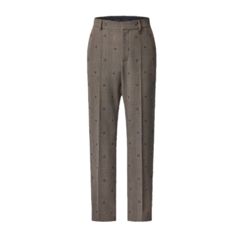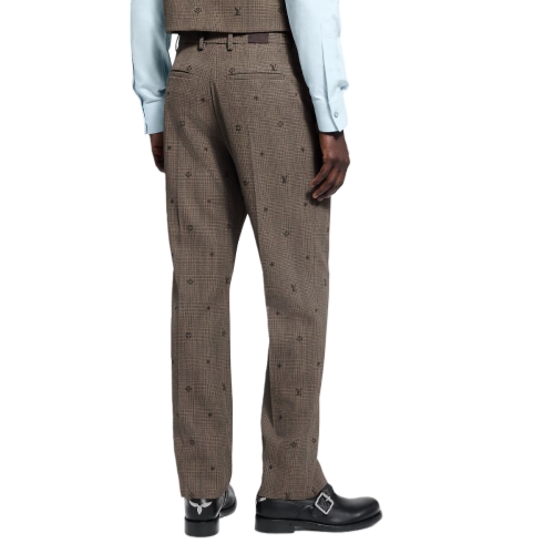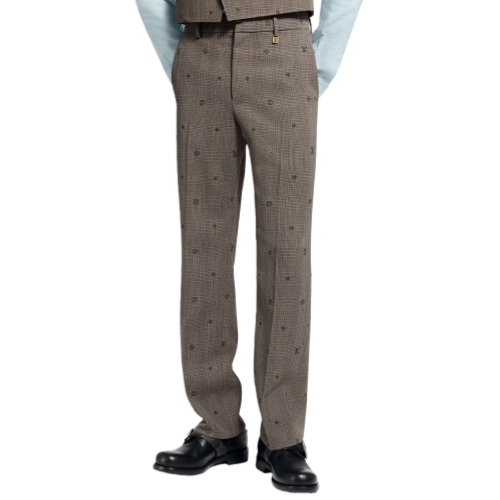 These elegant cigarette-fit pants are tailored in a fine wool jacquard inspired by British sartorial traditions. They feature a Monogram Prince of Wales pattern in subtle brown tones adorned with a spaced Monogram all over. Perfect for this collection’s dandy on a visit to the British countryside, they can be worn as part of a three-piece suit.