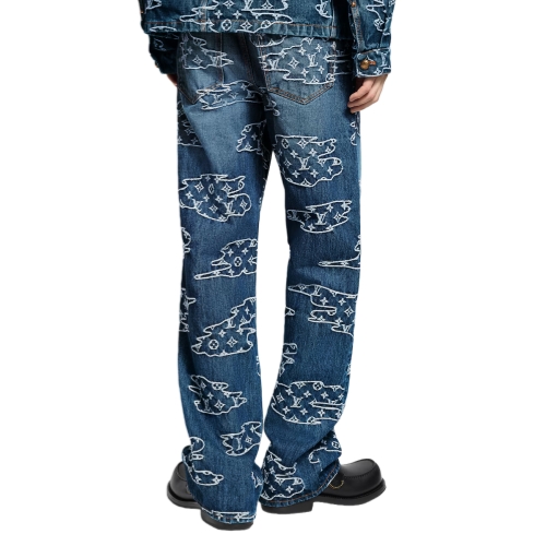 These washed denim skate pants are from the Fall-Winter 2025 show’s collaboration between Pharrell and Nigo. They are elevated with a graphic Monogram Clouds jacquard inspired by mending techniques from Nigo’s native Japan. A nubuck Mini Damier jacqueron signs the rear waist while a pearly button and rivets add a dandy finishing touch. A matching jacket makes standout look.