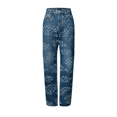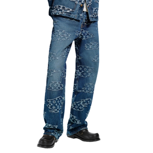 These washed denim skate pants are from the Fall-Winter 2025 show’s collaboration between Pharrell and Nigo. They are elevated with a graphic Monogram Clouds jacquard inspired by mending techniques from Nigo’s native Japan. A nubuck Mini Damier jacqueron signs the rear waist while a pearly button and rivets add a dandy finishing touch. A matching jacket makes standout look.