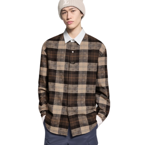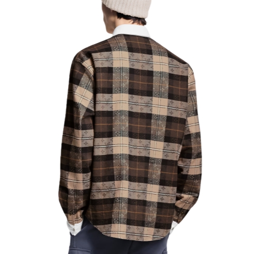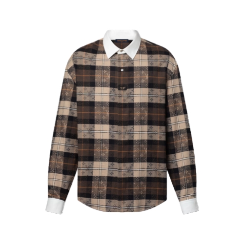 This long-sleeved top revisits the rugby polo shirt in soft cotton flannel with a sophisticated jacquard Monogram Tartan motif in autumnal brown and beige tones. The concealed button fastening creates the illusion of a half-button placket with two visible mother-of-pearl effect buttons and a woven LV patch, while the collar and cuffs are made of white cotton poplin.