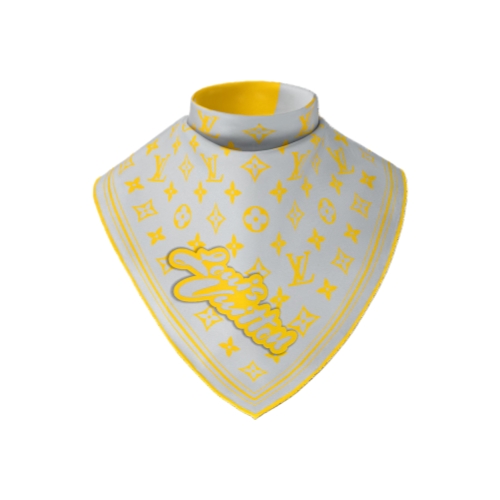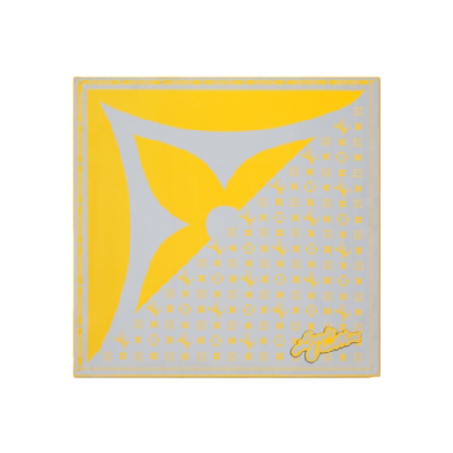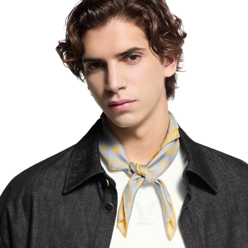 In bright yellow and light grey, the square Monogram Glow Bandana puts a cheery spin on timeless House elements. The design of the pure silk piece is diagonally split, with half featuring an oversized Monogram Flower and the other half the Monogram repeat. A bubble-letter take on the House name ties it altogether.