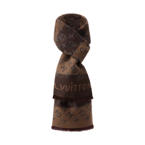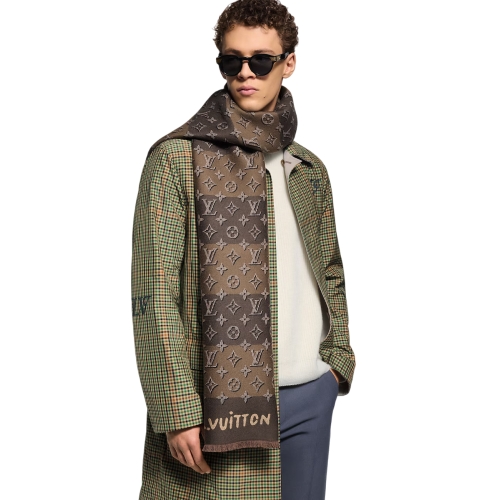 The Monogram Heritage scarf stylishly serves as cozy armor against a cold day. The graphic treatment at first appears simple but soon reveals clever nuances in a two-toned palette. Trompe l'oeil Monogram emblems appear embossed, juxtaposed against thick stripes of alternating neutrals. The result is mesmerizing.