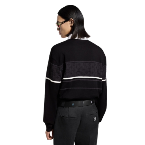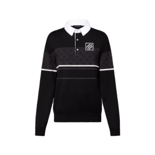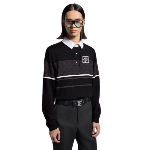 This chic take on a classic rugby shirt is crafted from soft, black organic cotton. It is elevated with a tone-on-tone Monogram, knitted with a subtle texture on a gray-black band across the chest and arms. Contrasting stripes stitched with a 3D effect add crisp accents, while mother-of-pearl buttons and an embroidered Marque L.Vuitton Déposée patch complete this preppy style.